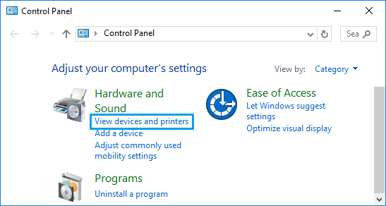 打开控制面板,切换到类别视图并单击“硬件和声音”部分下的查看设备和打印机链接。
