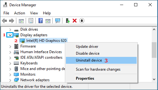 2.在设备管理器屏幕上,展开显示适配器条目 > 右键单击显卡,然后单击卸载设备 选项。