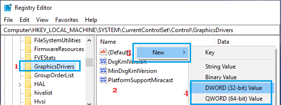 在注册表编辑器屏幕上,导航到HKEY_LOCAL_MACHINESYSTEMCurrentControlSetControlGraphicsDrivers