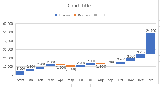 如上所述,只有 Excel 2016 及更高版本才能根据给定数据自动创建瀑布图。
