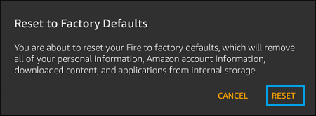 您将看到一个弹出窗口,点击重置选项以将您的 Kindle Fire 设备重置为出厂设置。在此阶段,如果您不确定并且不想将 Kindle Fire 恢复出厂设置,可以点击“取消”。
