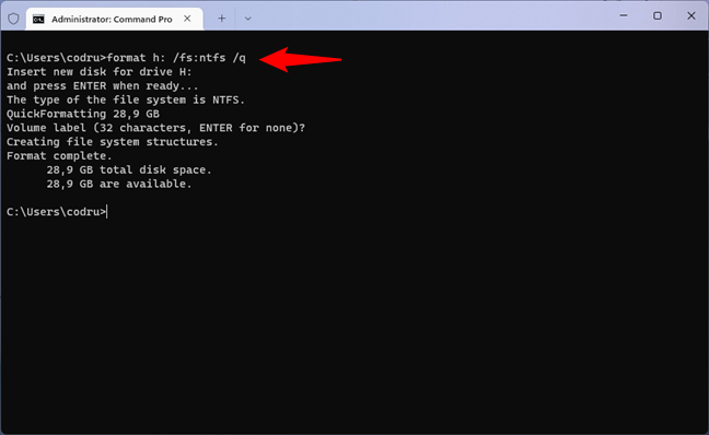 …将 [drive letter] 替换为您要格式化的驱动器的盘符,并将 [file system] 替换为您喜欢的文件系统类型。/q参数允许您进行快速格式化,但如果您想运行常规格式化,则可以将其省略。例如,这是我们使用NTFS 文件系统快速格式化盘符为h:的 USB 记忆棒的命令: