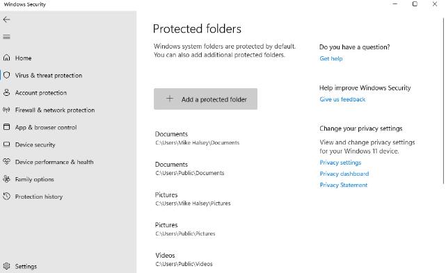 默认情况下,勒索软件保护将保护您的所有文档文件夹、 文档、图片、音乐和 视频,但您可以根据需要添加其他文件夹,这可能是因为您已将文件和文档移动到 PC 中与其他驱动器不同的驱动器安装 Windows 的那个。