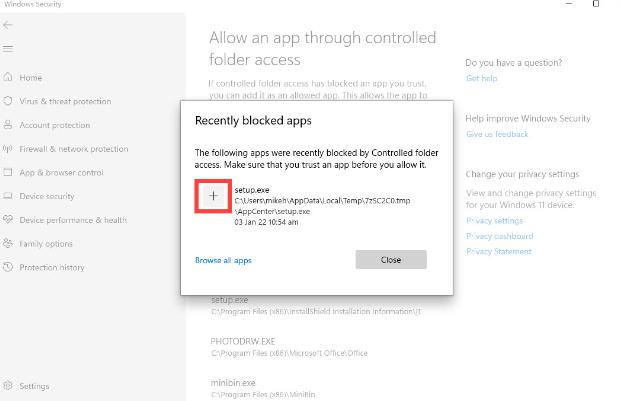 我已经提到过勒索软件保护可以阻止某些程序,尤其是游戏。单击 允许应用程序通过受控文件夹访问链接,您可以将应用程序和游戏添加到排除列表,就像将文件夹添加到保护中一样。有 浏览所有应用程序或添加 最近被阻止的应用程序的选项。