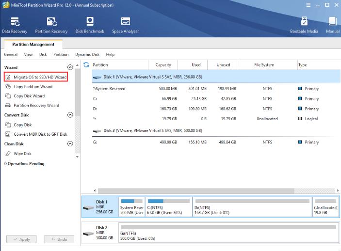 第 1 步:启动 MiniTool 分区向导,然后 从向导菜单中单击将操作系统迁移到 SSD/HD 向导。