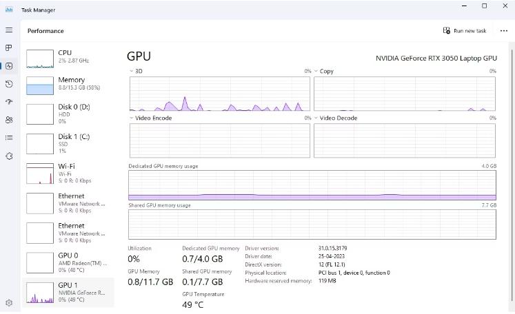 在这里,您将获得有关 GPU 实时使用情况的详细信息。这些图表提供了对共享内存使用、视频编码和高优先级计算的见解。右键单击每个图表可以访问其他相关信息。