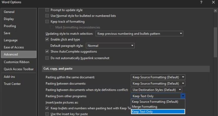 您可以更改对各种粘贴形式的偏好;从其他程序粘贴将处理从您的浏览器或其他应用程序复制的文本。将其设置为仅保留文本以粘贴纯文本。如果这对您有用,请不要错过使用 Microsoft Office 的 KeyTips获得更多快捷方式。