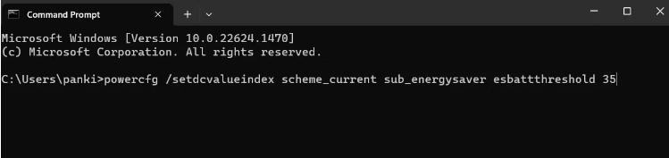 将上述命令中的<BatteryPercentage>替换为您希望省电模式自动启动的百分比。与“设置”应用程序不同,您可以使用命令行方法指定 0 到 100 之间的自定义电池电量百分比。