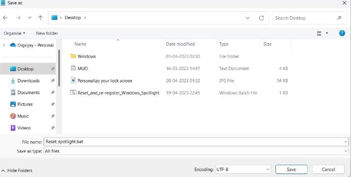 :: Reset Windows Spotlight DEL /F /S /Q /A "%USERPROFILE%/AppData\Local\Packages\Microsoft.Windows.ContentDeliveryManager_cw5n1h2txyewy\LocalState\Assets" DEL /F /S /Q /A "%USERPROFILE%/AppData\Local\Packages\Microsoft.Windows.ContentDeliveryManager_cw5n1h2txyewy\Settings" :: Re-register Windows Spotlight PowerShell -ExecutionPolicy Unrestricted -Command "& {$manifest = (Get-AppxPackage *ContentDeliveryManager*).InstallLocation + '\AppxManifest.xml' ; Add-AppxPackage -DisableDevelopmentMode -Register $manifest}" - 粘贴以上代码后,将文件另存为“Reset_spotlight.bat”在桌面上。为此,请单击顶部菜单中的文件,然后选择另存为。