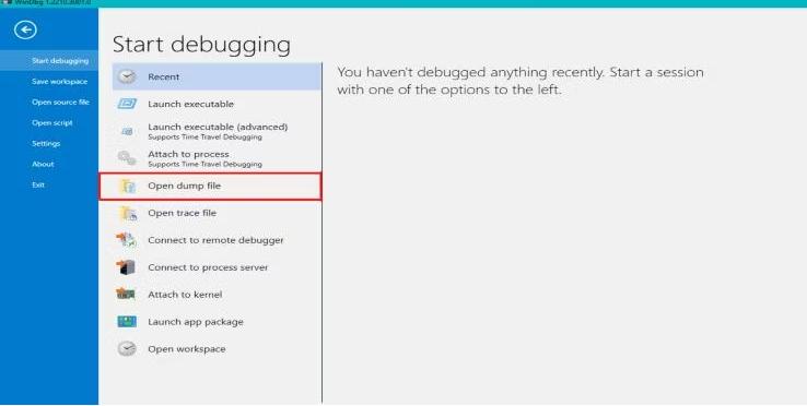 获得转储文件后,您可以在 WinDBG 中打开它。为此,打开WinDBG,选择文件,然后单击打开转储文件。