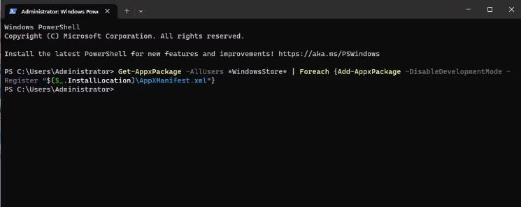 Get-AppxPackage -AllUsers *WindowsStore* | Foreach {Add-AppxPackage -DisableDevelopmentMode -Register “$($_.InstallLocation)\AppXManifest.xml”} - 此过程可能需要一些时间才能完成,具体取决于需要重新注册和重新安装的应用程序的数量。