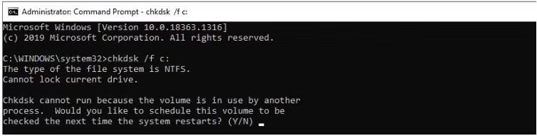 - 下次启动时会有一个提示询问您是否要运行 CHKDSK。键入Y并按 Enter。