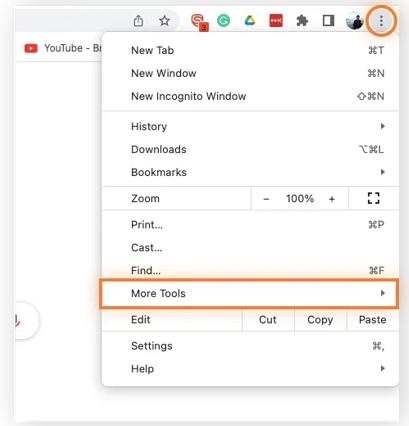 - 打开 Chrome 并单击浏览器右上角的更多(三个点),然后选择更多工具。