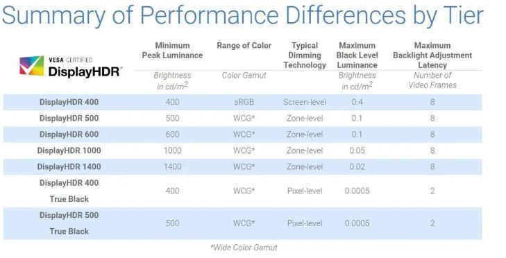 您可能会注意到 DisplayHDR 包括两项“纯黑”认证,要求最低暗度低得离谱,为 0.0005cd/m2。只有OLED可以实现这一点。不幸的是,只有一款 OLED 显示器获得了认证,而且还无法购买。其他 DisplayHDR True Black 显示屏是特定笔记本电脑独有的。