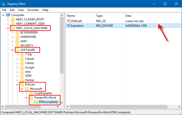 步骤 4 :要禁用 PIN 过期:您可以删除过期 DWORD。