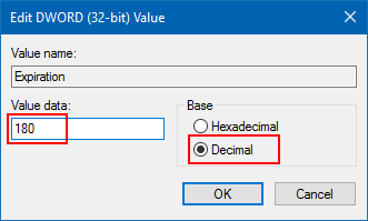 步骤 3:要启用 PIN 过期:选择 Decimal ,输入1 到 730天之间的数字 作为过期时间,然后单击 OK。