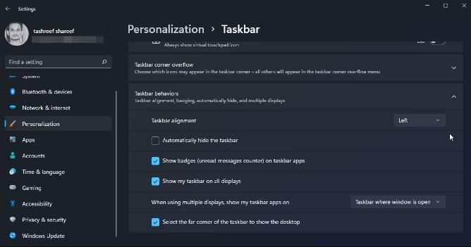 - 单击任务栏对齐下拉菜单并选择左。Windows 11 任务栏现在将移至左侧。