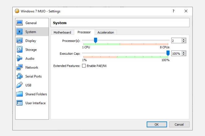 现在,在“系统”选项卡下,选择“处理器”。您可以选择通过分配另一个处理器核心来为 Windows 7 虚拟机分配更多处理能力。如果您有多核系统,分配额外的核心将为您带来更快的虚拟机体验。根据您的系统硬件,这可能会导致主机性能降低。