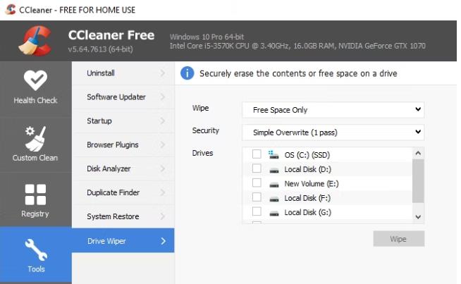 第三个选择是使用 CCleaner 的驱动器擦除选项将驱动器上的空白空间清零。驱动器擦除将永久删除驱动器上旧文件位置的链接,但仅在空闲区域运行。您可以将数据复制到另一个驱动器(或将其删除),然后删除数据。