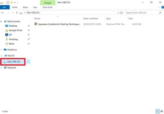 在文件资源管理器应用程序中,从左侧面板的位置列表中选择您的闪存驱动器。