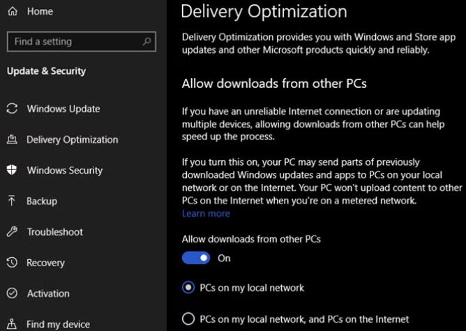 为了解决这个问题,您可以调整一些 Windows 更新设置。访问设置 > 更新和安全 > 交付优化。如果您打开了“允许从其他电脑下载”滑块,Windows 将使用类似点对点的连接在您的计算机和其他计算机之间共享 Windows 更新。您可以选择与本地网络或整个互联网上的电脑共享。