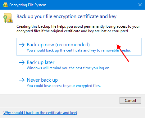 使用该选项,您的 EFS 证书可以轻松快速地备份。