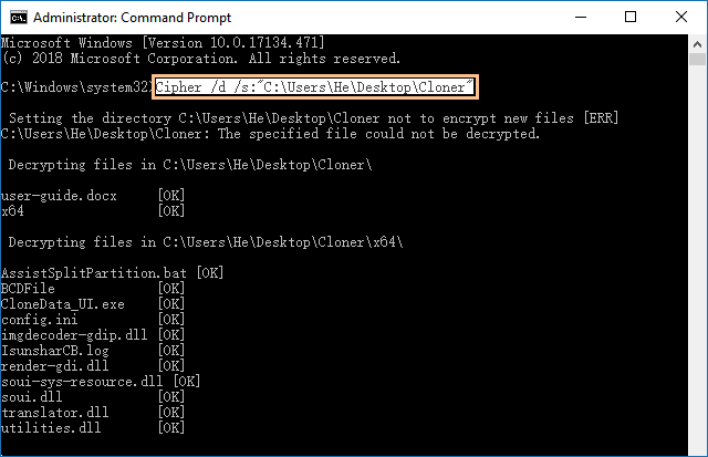 要解密包含子文件夹和文件的文件夹,请键入:cipher /d / s:“文件夹的完整路径”。
