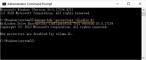 要暂停对系统和固定数据驱动器的驱动器 BitLocker 保护,请运行以下命令并按 Enter。将 H 替换为您要暂停保护的驱动器号。