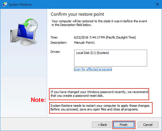 注意:如果您最近更改了 Windows 10 密码,则在开始系统还原之前,Microsoft 建议您创建密码重置盘。它还提醒您保存所有打开的文件并关闭所有程序。