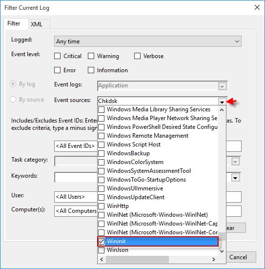 步骤 3:从下拉菜单中检查事件源中的Chkdsk和Wininit项。