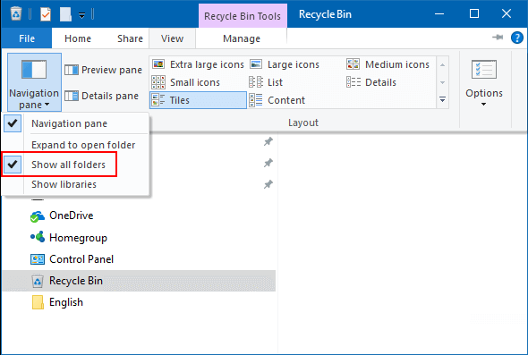 选项 1:打开文件资源管理器。右键单击导航窗格中的空白区域,然后单击 显示所有文件夹 以检查它,回收站正在显示。要再次隐藏回收站,请取消选中“显示所有文件夹”选项。
