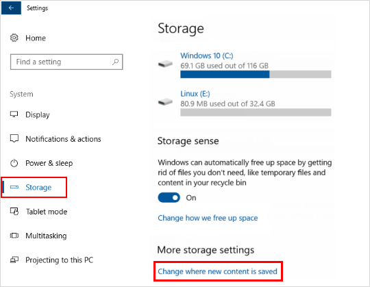 步骤 2:选择 左侧窗格中的“存储”,单击 右侧“更多存储设置”下的“更改新内容的保存位置”链接 。