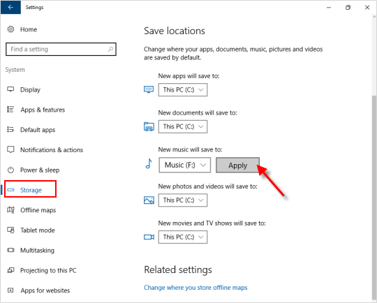 步骤 3:选择默认保存 应用程序、 文档、 音乐、 照片和视频、 电影和电视节目以及 离线地图的驱动器 ,然后单击“应用”。
