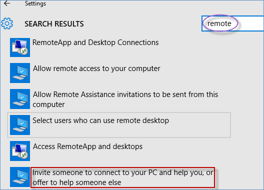 步骤2:在“设置”应用程序窗口中,在右上角的空白框中写入“远程” 。同样,只需点击邀请某人连接到您的电脑并为您提供帮助,或主动提出快速帮助其他人。