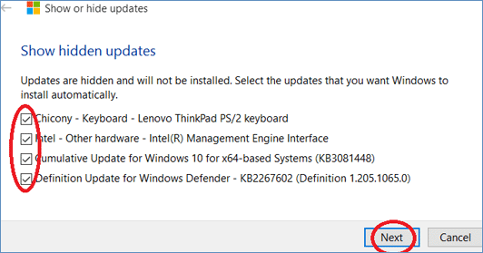 注意:如果要安装隐藏的更新,请再次打开“显示或隐藏更新疑难解答”,然后单击“显示隐藏的更新”。