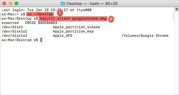 步骤 3:输入hdiutil Attach googlechrome.dmg并按 Enter 键。将googlechrome替换为您的 .dmg 文件名。