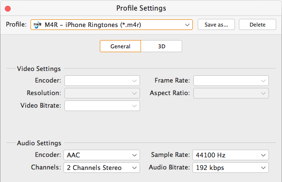 为了更好地控制音频质量,此 M4R 转换器通过单击“设置” (“配置文件”附近)为您提供高级配置(编码器、采样率、通道和比特率),这将打开一个新窗口,如下图所示。您可以根据需要调整它提供的参数。