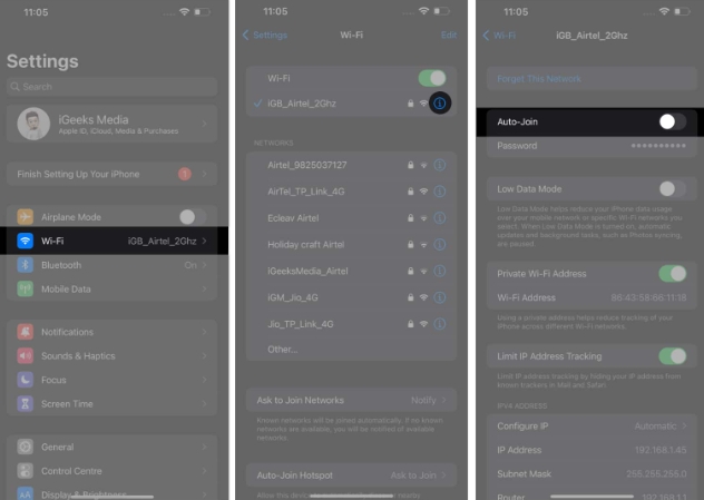 因此,您必须禁用自动连接到已保存的 Wi-Fi 网络以维护安全的网络。此外,手动选择可信网络可以减少对金融交易、个人数据或其他机密信息等敏感信息的威胁。