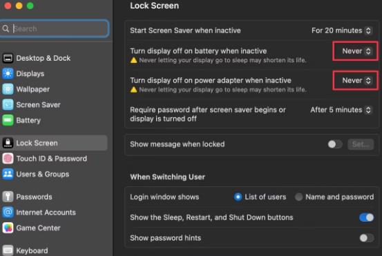 - 从“不活动时使用电池关闭显示器”选项旁边的下拉菜单中选择从不。
