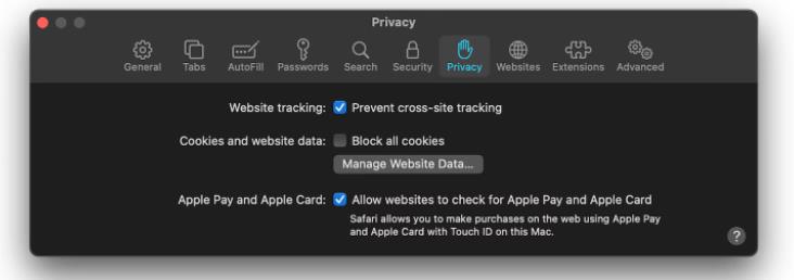 要删除您访问过的网站存储的数据,请再次单击 Safari 菜单,然后单击首选项。选择隐私选项卡,然后选择管理网站数据。