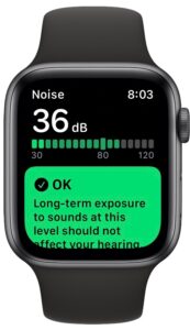 适用于 Apple Watch 的 Noise 应用程序适用于运行 watchOS 6 或更高版本的机型,它允许用户使用内置麦克风测量周围环境的噪音水平,具体取决于曝光持续时间。如果 Apple Watch 识别出高于特定阈值的声级,该应用程序甚至可以提醒您,这可能会对您的听力产生负面影响。您还可以将这个简洁的功能用作 Apple Watch 的分贝计。