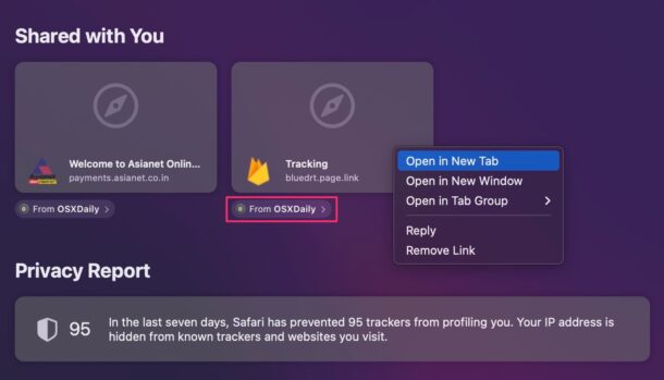 - 从 Dock 启动 Mac 上的“Safari”,您会在起始页上找到新的与您共享部分。您可以单击链接立即打开它。