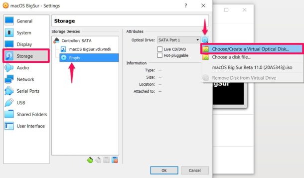 - 现在,转到“存储”类别,然后单击“存储设备”下的“空”。然后,单击右侧的光盘图标,然后从下拉菜单中选择“创建虚拟光盘”。