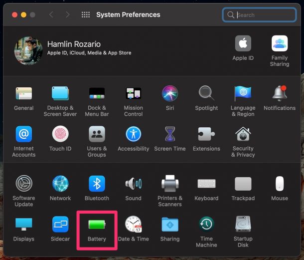 - 这应该会在屏幕上的新窗口中打开“系统偏好设置”面板。在这里,单击“电池”继续下一步。