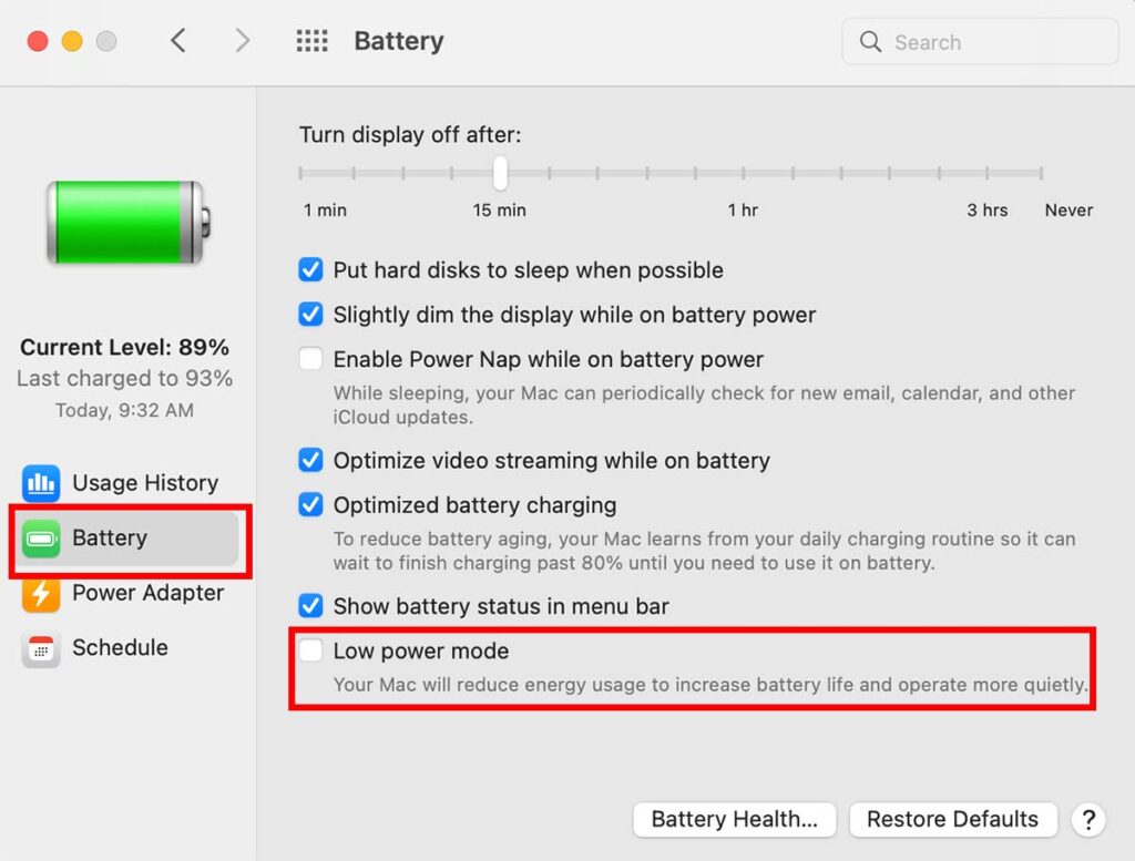 低功耗模式的工作方式与 iPhone 上的类似。 您的 Mac 将减少能源使用并更安静地运行。 如果您的 MacBook 电量不足,并且您想要执行不那么密集的任务,例如网页浏览或视频流,您可以启用低电量模式以延长电池寿命。
