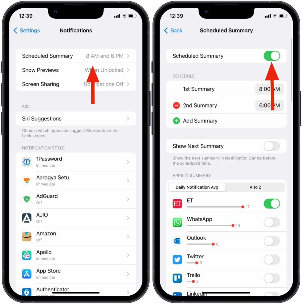 假设您想在 iOS 15.4 上继续使用计划摘要。 从“计划摘要”菜单中,浏览摘要中的应用程序并禁用重要应用程序的切换。
