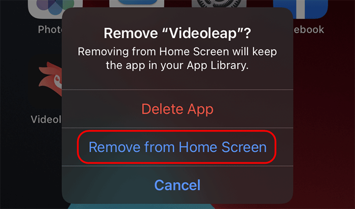 第 2 步:出现第二个菜单后,点击从主屏幕移除。该应用程序将立即从您的主屏幕上消失,但仍会保存在您的应用程序库中。
