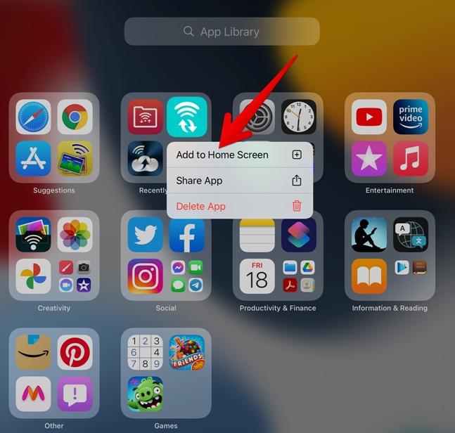 要将应用程序从应用程序库移动到主屏幕,请在应用程序库中长按其应用程序图标。从选项中选择添加到主屏幕。应用程序图标将添加到 iPad 的主屏幕。如果应用程序图标已添加到主屏幕,您将看不到添加到主屏幕选项。