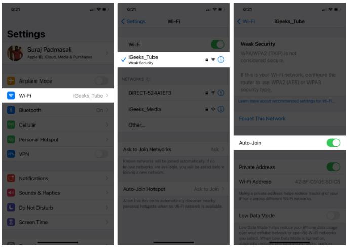 注意:有时,您的设备可能会自动加入您过去可能无意或有意连接的开放、非工作网络,而不是实际网络(家庭、办公室等)。要解决此问题,请点击此 Wi-Fi 名称旁边的“ i ”,然后关闭 Auto-Join 的切换开关。