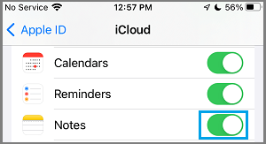 在 iPhone 上:转到设置> 点击您的Apple ID 名称> iCloud > 将Notes旁边的切换开关移至ON位置。